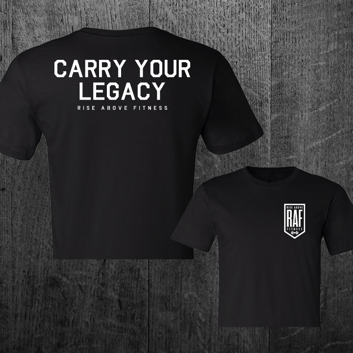 Women's Rise Above Fitness Custom Cut Cropped Tee with Cap Sleeve; "RAF BADGE" Front Pocket Print; "CARRY YOUR LEGACY" Back Print